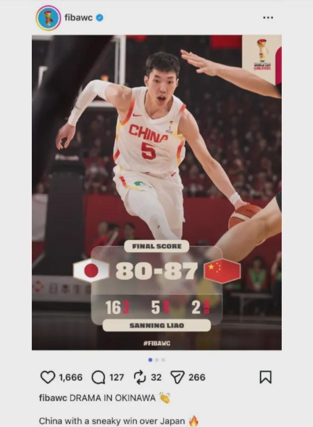 遗憾的是,国际篮联赛后在官网点评中国男篮的胜利时,用“中国男篮从日本偷走一场胜利”来形容!